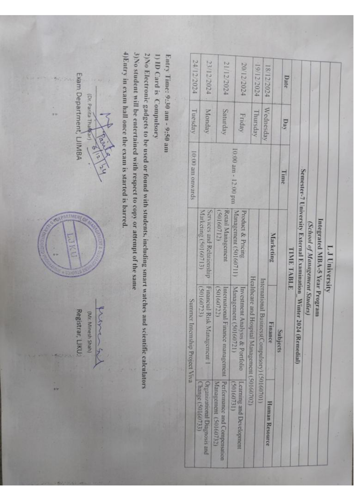 10.12.24: Semester 7 University Winter 2024 Examination (External Remedial) Time Table