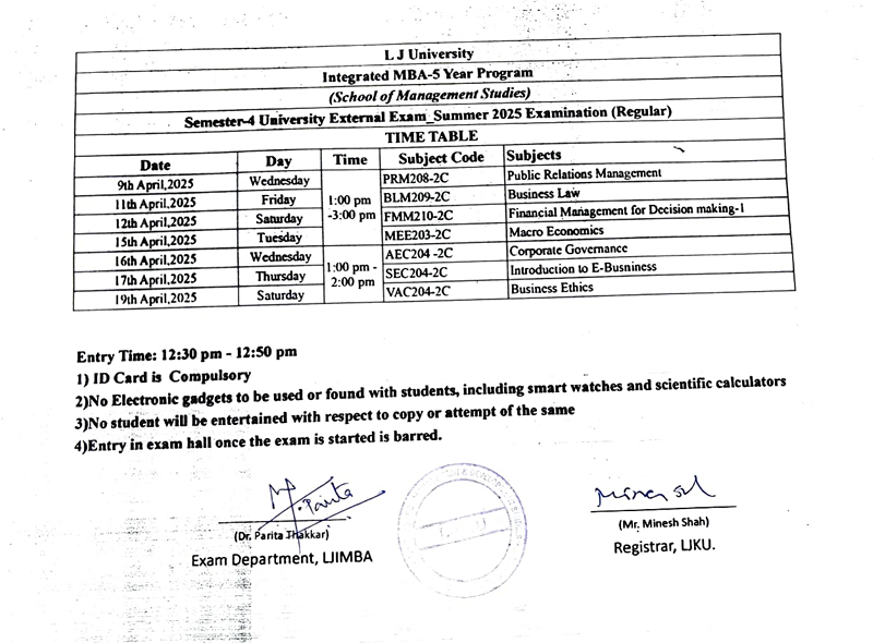 07.04.25: Semester 4 University Summer 2025 Examination (External Regular) Time Table