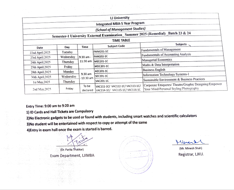 07.04.25: Semester 1 batch(23&24) University Summer 2025 Examination (External Remidial) Time Table